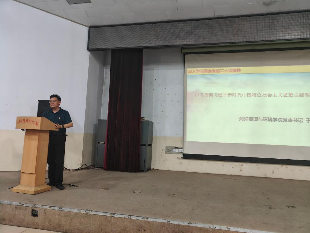 学院党委书记于明来向学院全体在校学生,共494人,讲授题为《深入学习领会党的二十大精神》的专题党课,从主题教育的总要求和根本任务出发,结合学院和学生实际,通过探讨世界百年未有之大变局下的“强国建设之问”“教育发展之问”“青年成长之问”,勉励青年学生肩负起时代赋予的伟大责任与历史使命,努力争做德智体美劳全面发展的有远见、有梦想、有抱负、有才华、有干劲的新时代“五有”青年。学院副院长张文香同志向学院全体教师,共50人,以《不忘初心牢记使命,认真做好教学工作》为题,从教育的初心使命、对教育事业的责任及对教师称谓的担当等三方面讲述作为新时代教师所承担的历史使命和责任。学院副书记副院长孙胜显同志向21级水产、水族专业学生,共60人,以《改革开放以来经济建设的伟大成就》为题带领大家回顾了改革开放以来我国的经济发展历程及取得的成就,讲述坚持党对一切工作的领导的重要性,呼吁大家将习近平新时代中国特色社会主义思想和经济学思维相结合,进行深入讨论和思考。