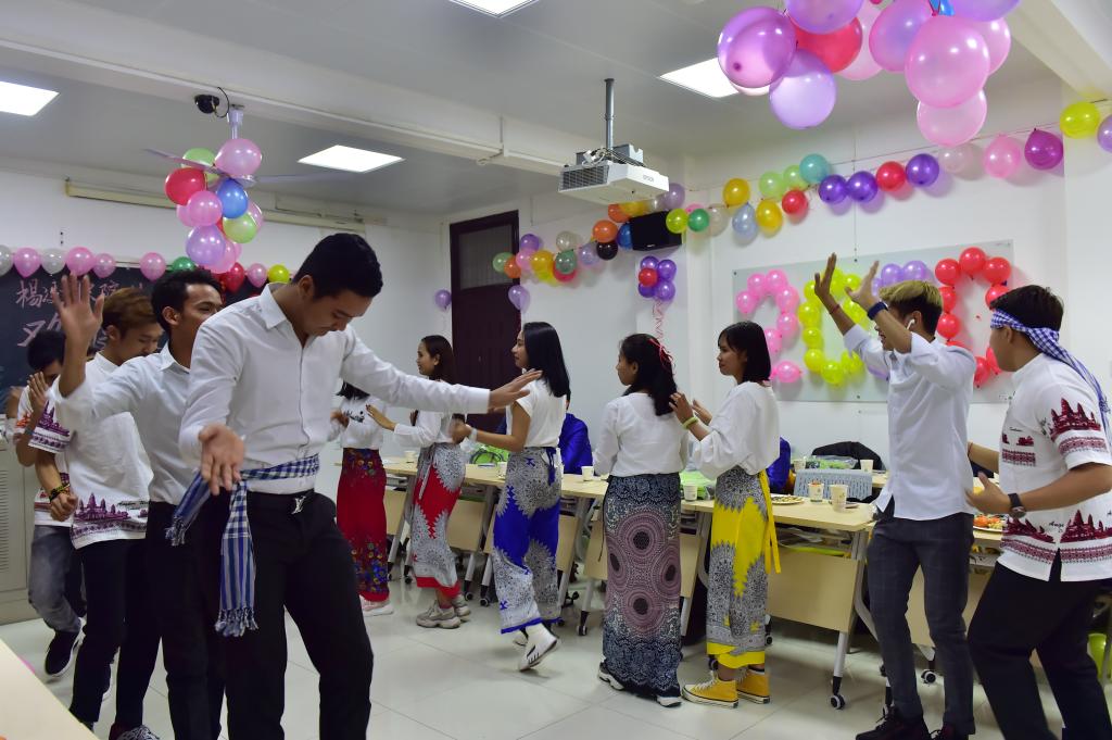 晚会以汉语语言类节目为主,包括汉语诗朗诵《面朝大海 春暖花开》、汉语合唱《我的好兄弟》和《月亮代表我的心》,并精心准备了《击鼓传花读汉语》、《写汉字大比拼》《汉语悄悄话》等汉语类游戏。在汉语介绍节目中,4名留学生用新学习的汉语介绍了在柬埔寨和中国的生活,表达了他们对中国文化的热爱、对学院老师们的感谢。在柬埔寨音乐的伴奏下,留学生们载歌载舞,将晚会气氛推向高潮。。