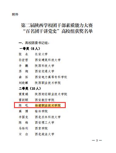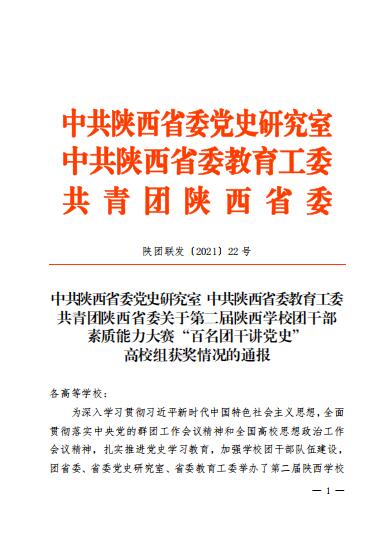 近日,在团省委、省委党史研究室、省委教育工委举办的第二届陕西学校团干部素质能力大赛中,学校陈吼获团委书记组二等奖,药物与化工学院罗燕获专职团干部组三等奖,水利工程学院学生孔宝罗获学生团干部组优秀奖。