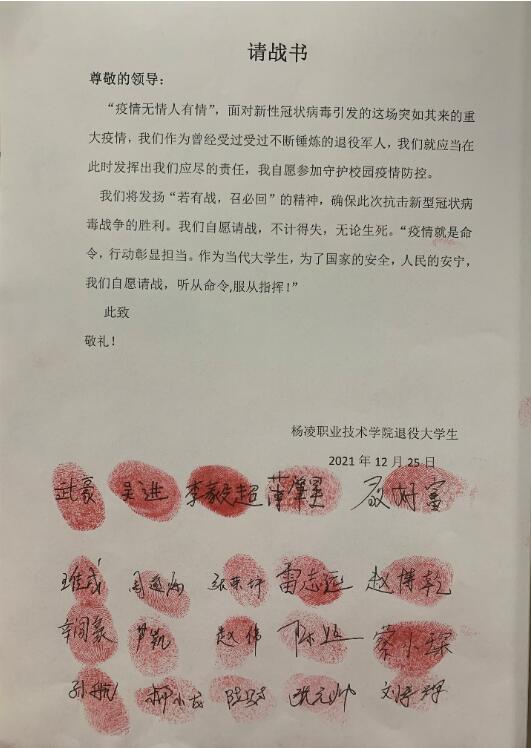 疫情就是命令,防控就是责任。在疫情防控中,以实际行动践行“若有战、召必回”的使命担当,凝聚众志成城、共克时艰的磅礴青春正能量,为广大师生做好抗疫特殊时期的服务工作。他们写下请战书,宣誓坚守岗位、严守纪律、服从指挥,与全校师生携手积极参与到学校疫情防控工作各个环节,体现了当代杨职学子的本色和担当。面对低温、寒冷的天气,他们永不退缩,积极配合学校的防疫工作,参与我校核酸检测的疏导工作,志愿服务,守护有我,在平凡的工作岗位上诠释着自己的初心和使命。
