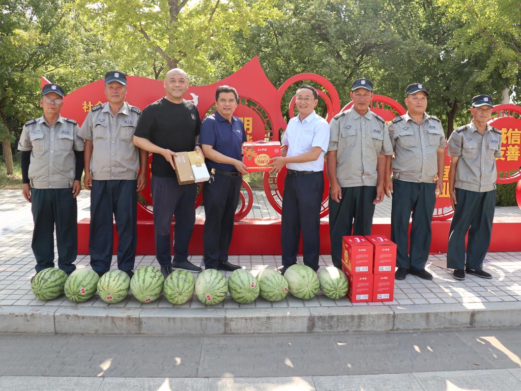 暑热炎炎,又到了一年的酷暑季节,为了对学校一线工作者在高温酷暑下依然坚守工作岗位的敬业奉献精神表达谢意,7月8日,校工会主席董育公看望并慰问了高温下依然坚守在岗位的门卫保安和食堂餐饮人员,为他们送去了清凉饮品和西瓜等慰问品。同时还为坚守在工作一线的教职工送去了清凉慰问品,并通过送清凉活动表达了学校对一线工作者的关怀和问候。