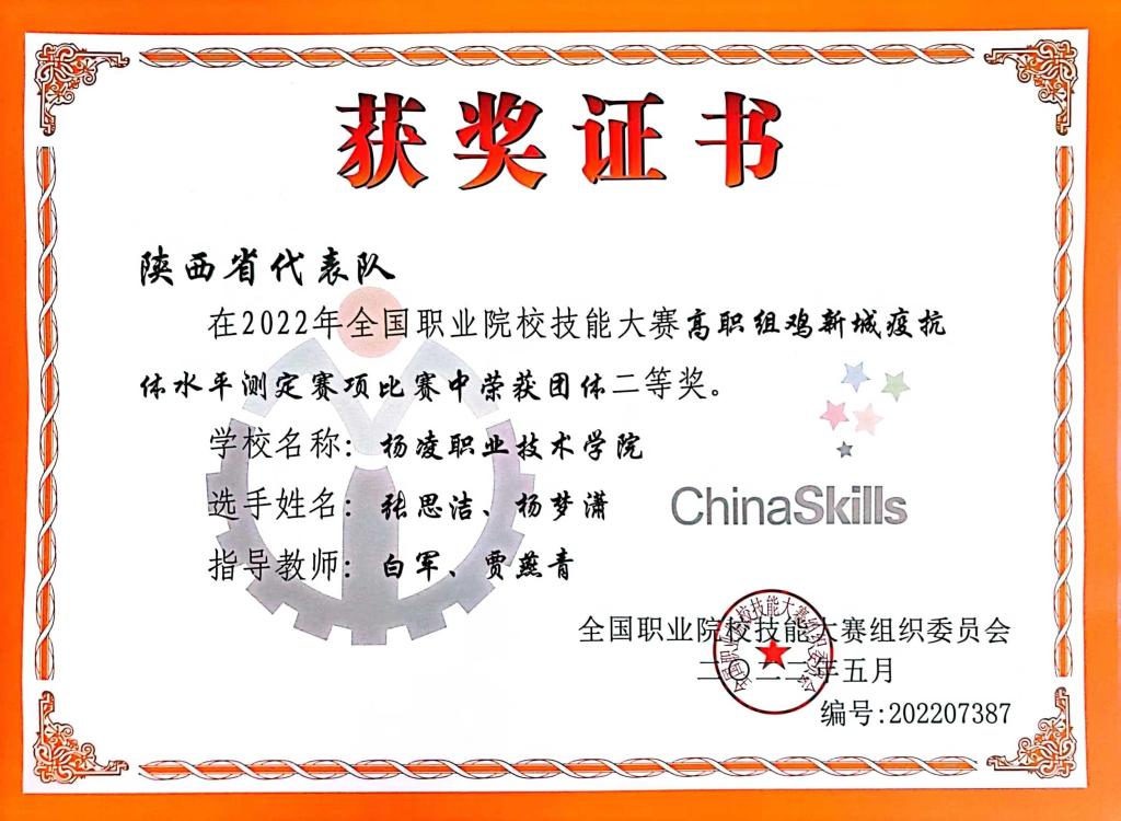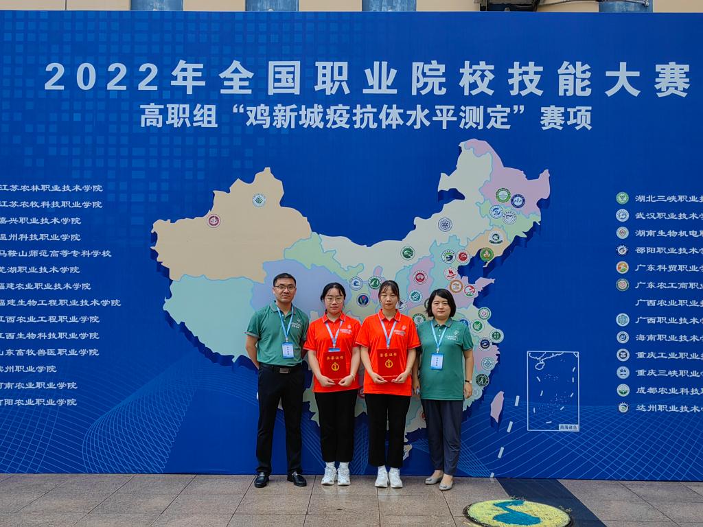8月16日至19日,2022年全国职业院校技能大赛高职组“鸡新城疫抗体水平测定”赛项在山东畜牧兽医职业学院举办,来自全国28个省份的51支代表队、102名选手参加了本次比赛。我校动物工程学院学生张思洁、杨梦潇以总分排名第六的成绩荣获二等奖第一名,这也是我校参赛以来取得的最好成绩。