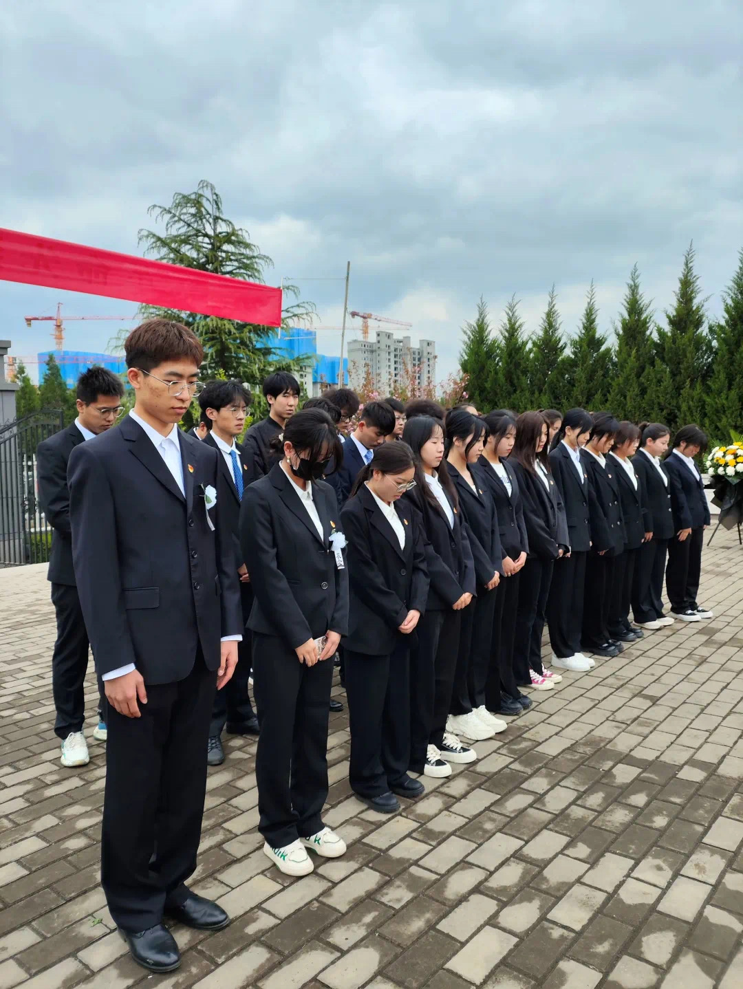 党员们身着正装、有序列队,怀着崇敬的心情进入陵园。在纪念碑前,大家重温入党誓词,瞻仰革命烈士纪念碑,聆听前辈们的英勇故事和感人事迹,默哀追思。随后,学生们走进陵园,为先烈献花、扫墓,表达深切的悼念与敬仰。