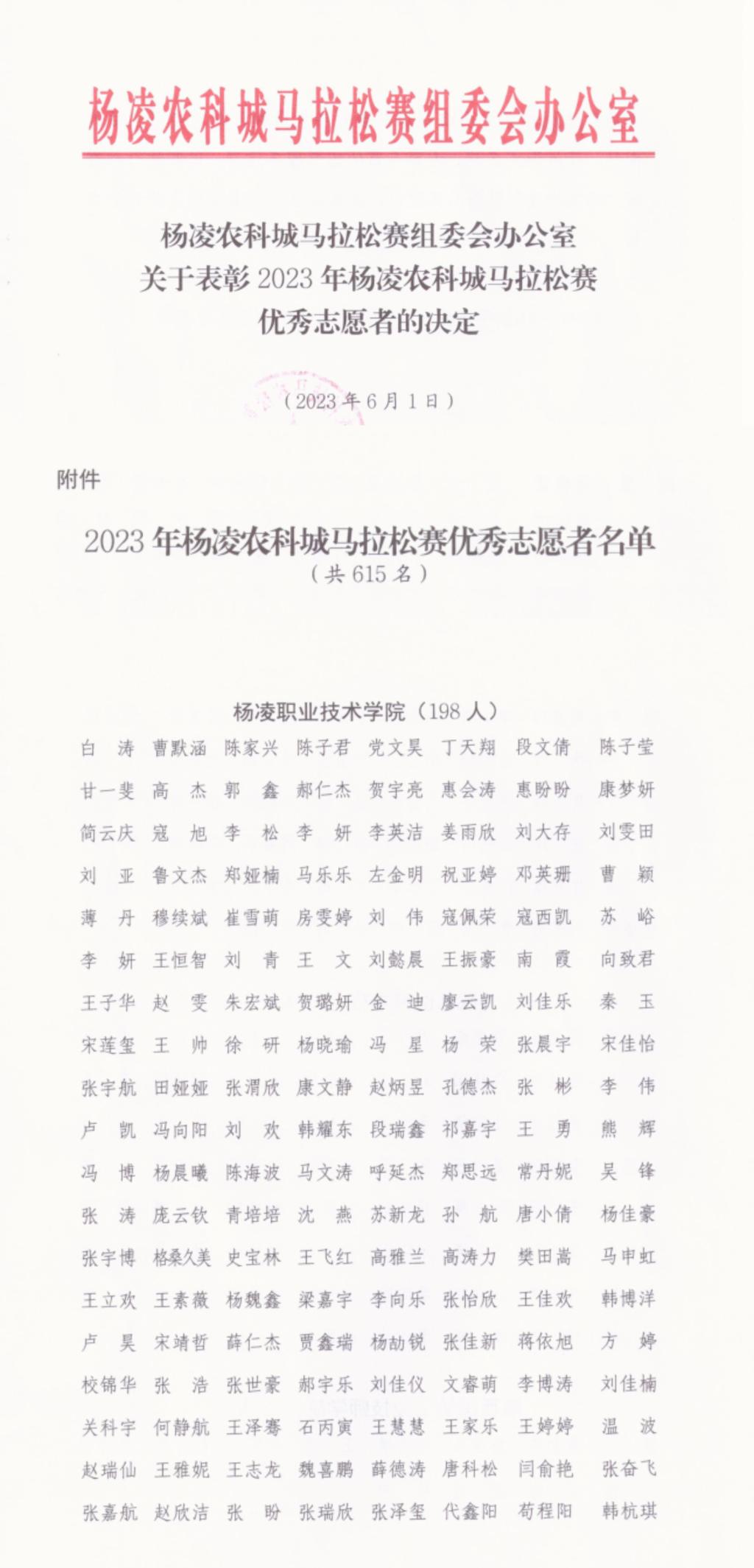 近日,杨凌农科城马拉松赛组委会通报表彰了2023年杨凌农科城马拉松赛优秀志愿者,我校198名志愿者受到表彰。