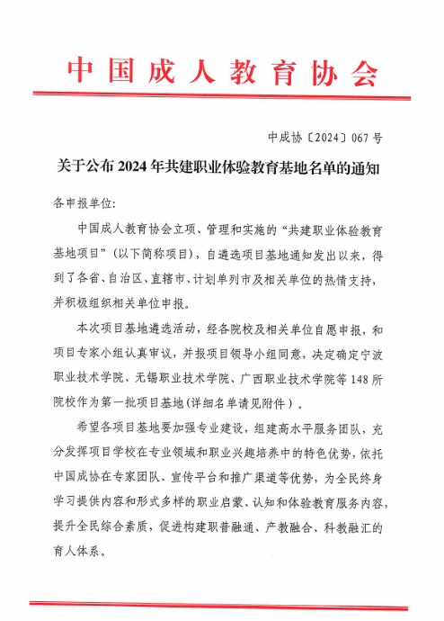 近日,中国成人教育协会公布了第一批全国共建职业体验教育基地名单,我校成功入选。