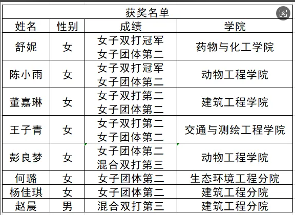 我校14名男女队员参加高职院校丙组的比赛,两队选手成功会师决赛,包揽女子双打冠亚军。此外,在女子团体和混合项目中,荣获女子团体第二名和混合双打第三名的好成绩。