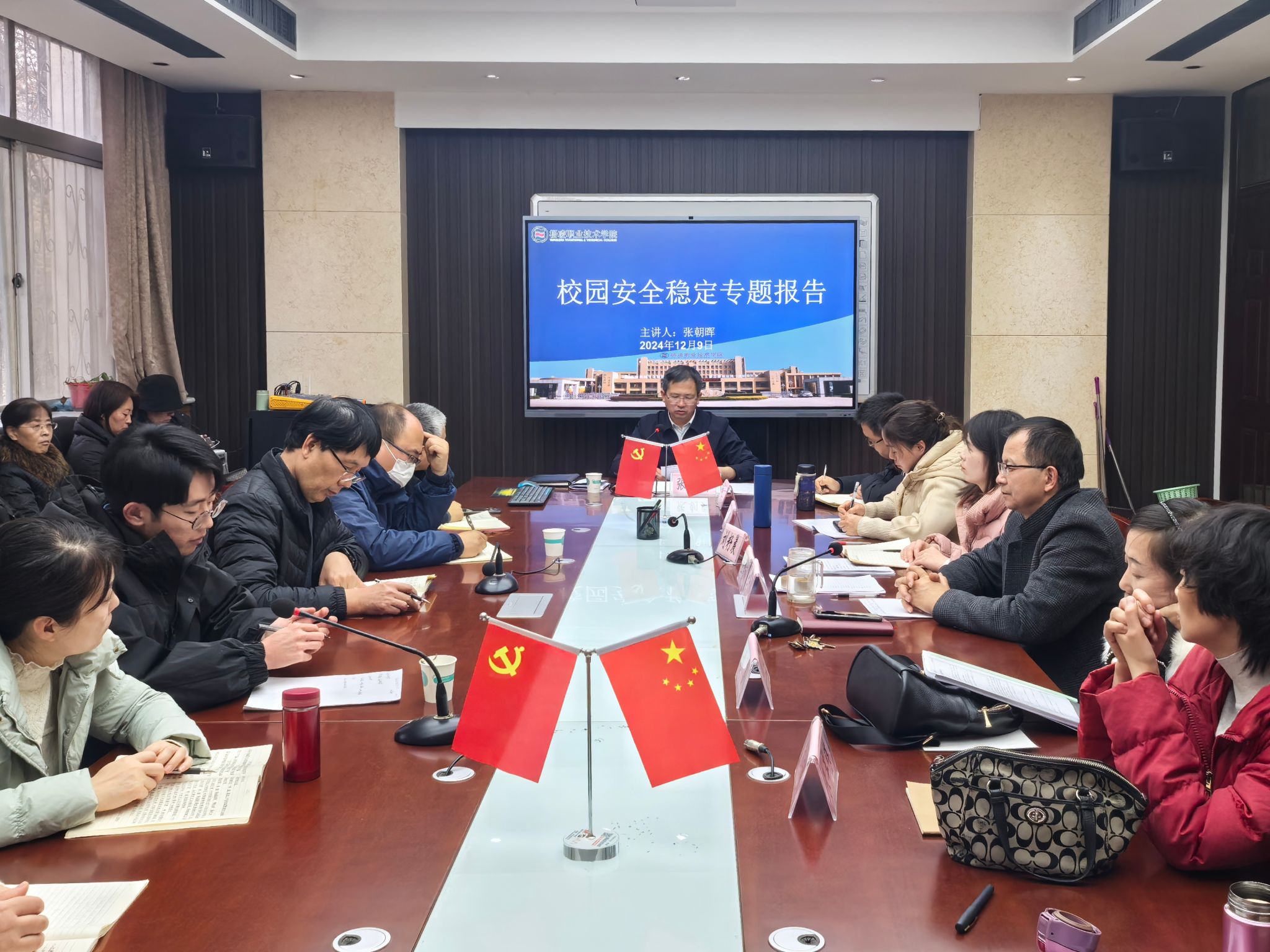 12月9日下午,副校长张朝晖为文理学院教职工作校园安全稳定工作专题报告。文理学院负责人和全体教职工聆听报告。