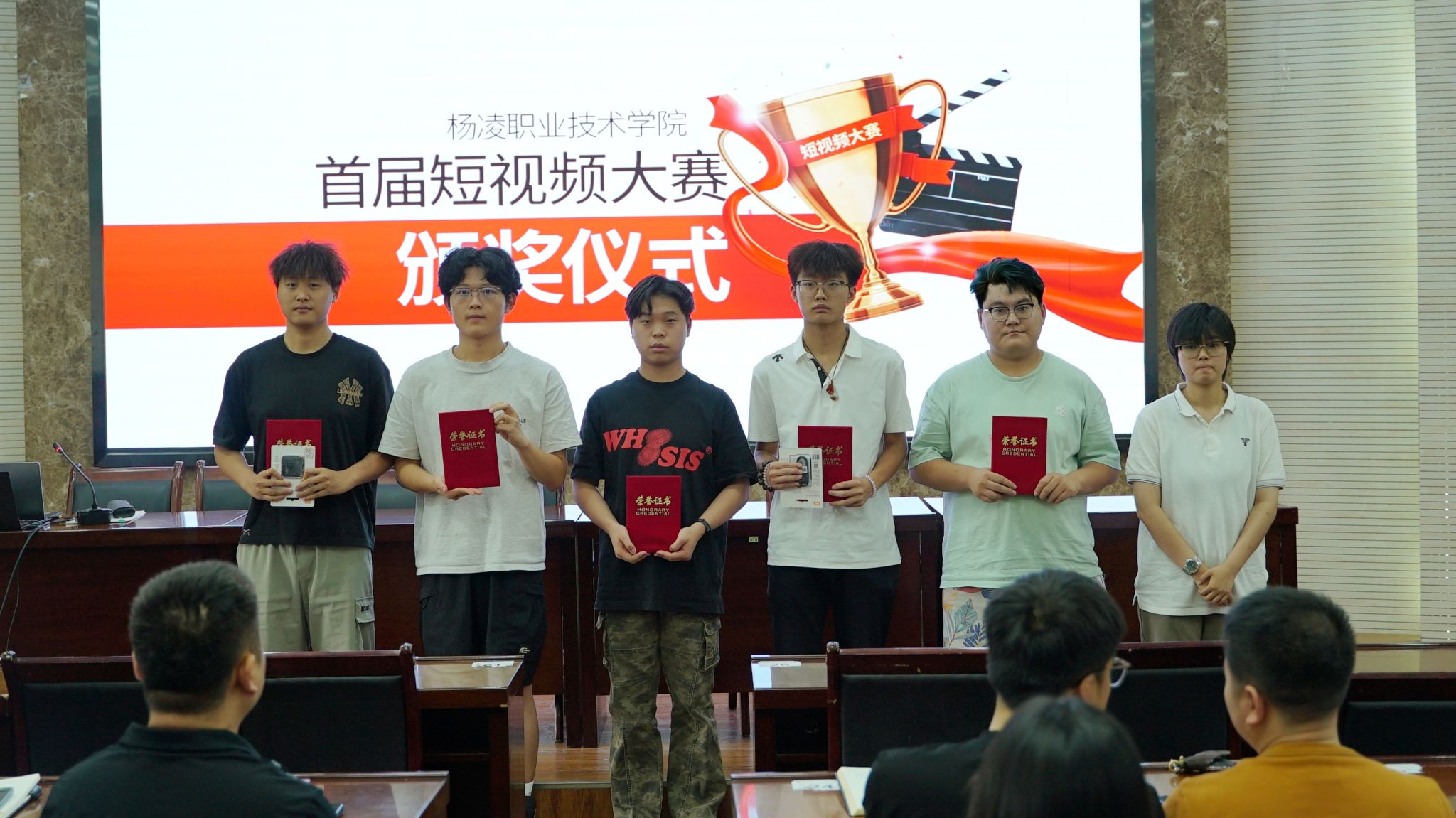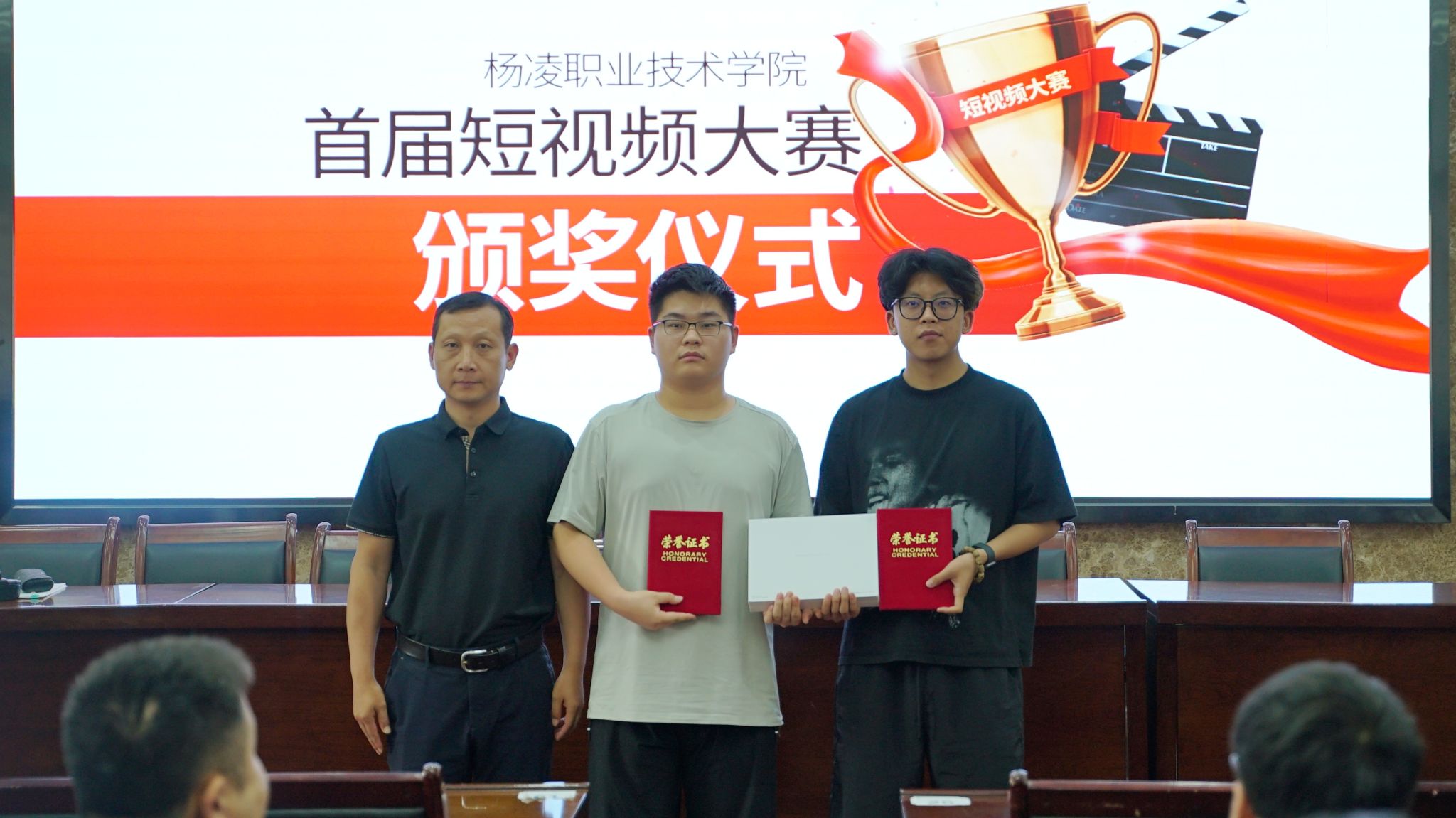 会议宣读了首届短视频大赛获奖的表彰决定。经济与贸易学院、水利工程学院学生合作的《航拍镜头下的杨职:校训是流动在建筑间的精神血脉》获一等奖,《邂逅千年的农耕文化》等 3 件作品获二等奖,《视频里的每一帧都是值得回忆的青春时光》等 10 件作品获三等奖。