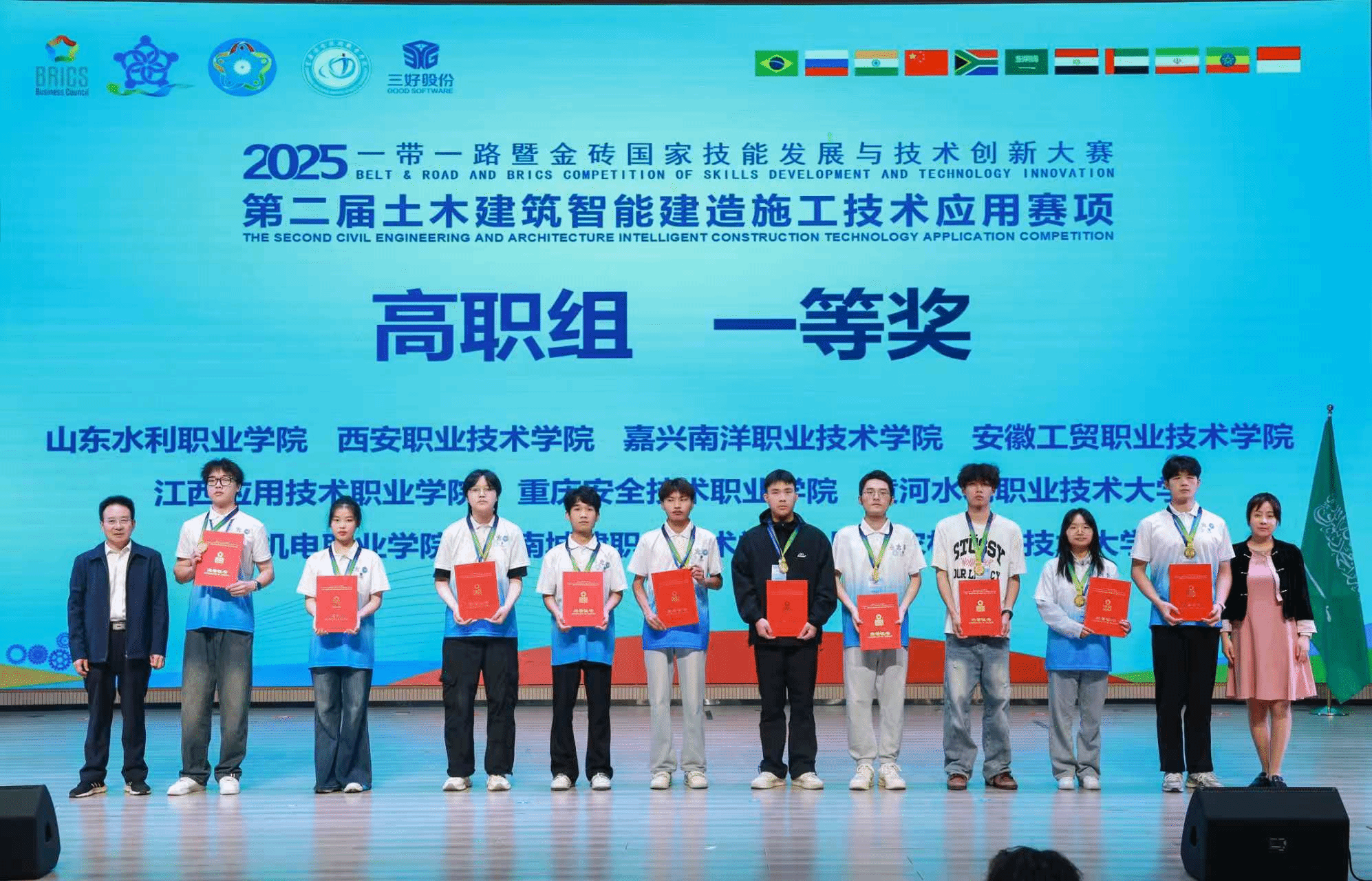 10月17日至19日,2025一带一路暨金砖国家技能发展与技术创新大赛第二届土木建筑智能建造施工技术应用赛项全国总决赛在重庆安全技术职业学院圆满落幕。经激烈比拼,我校建筑工程学院智能建造技术专业学生刘皓名、邓苏滨,凭借扎实的专业技能、优良的职业素养与出色的团队协作,获高职组一等奖,教师苟胜荣、刘鹏飞获教师组一等奖。学校获评高职组与教师组最佳组织奖,指导教师王琦、刘鹏飞获评优秀指导教师。