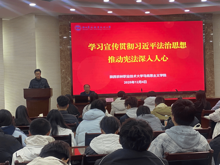 12月4日,马克思主义学院举办宪法宣传周法治报告会暨时政讲坛第39讲,特邀西北农林科技大学人文社会发展学院副教授张祖庆作“‘12.4’宪法日法治正当时”专题辅导报告。学校思政课教师及学生代表共100余人参加。