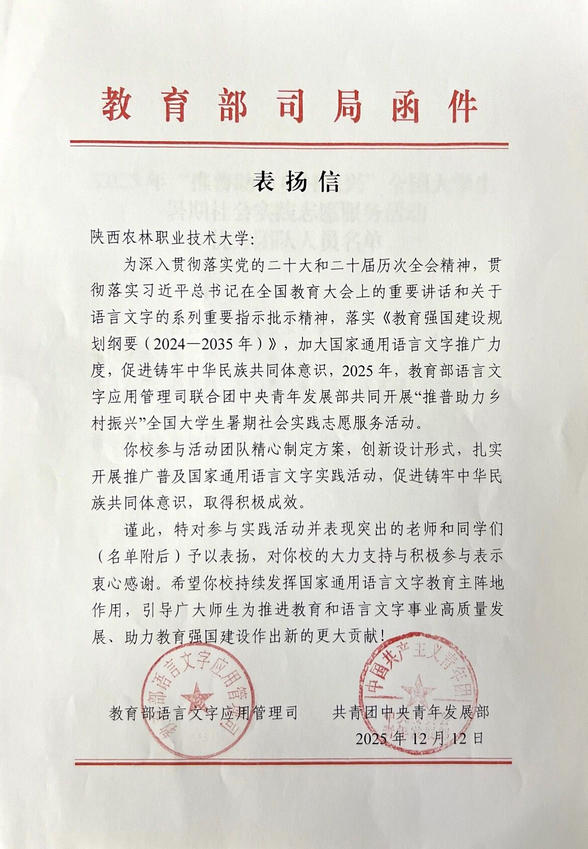 12月12日,教育部语言文字应用管理司与共青团中央青年发展部向学校发来表扬信,对团队师生予以表扬,向学校的大力支持和积极参与表示感谢。表扬信中指出,我校“耕读兴农・青语筑梦”暑期社会实践团精心制定方案,创新设计形式,扎实开展推广普及国家通用语言文字实践活动,促进铸牢中华民族共同体意识,取得积极成效。