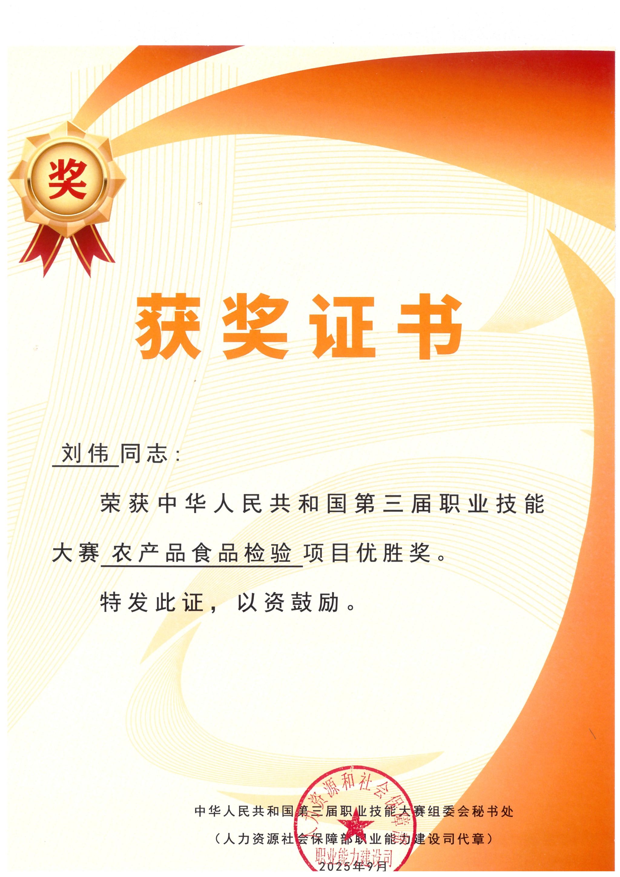 近日,人社部公布了第三届全国职业技能大赛获奖名单,我校生物工程学院教师刘伟代表陕西省参加农产品食品检验赛项比赛,荣获优胜奖。