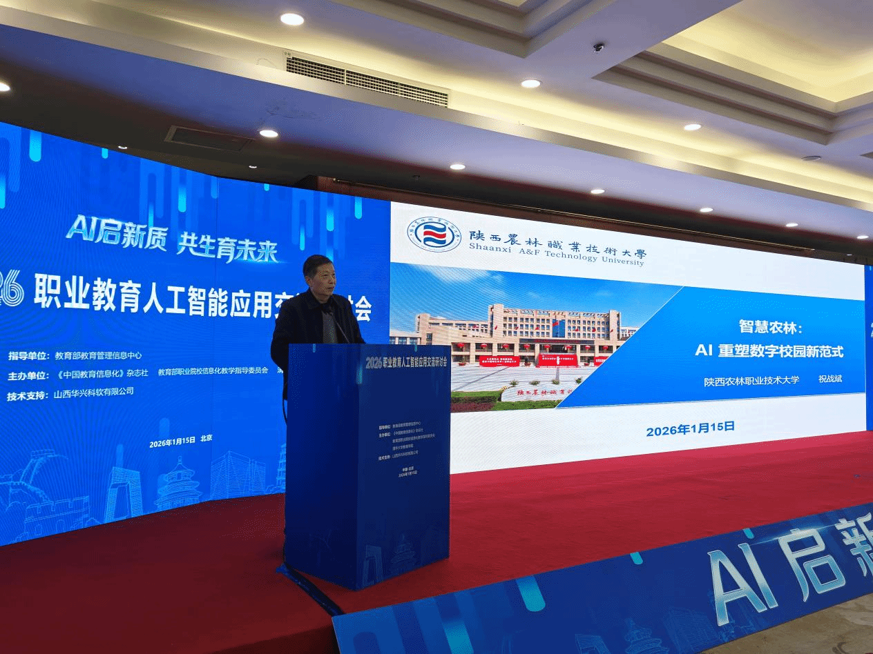 1月15日,由教育部教育信息管理中心牵头,教育部职业院校信息化教学指导委员会和清华大学教育学院联合承办的2026年职业教育人工智能应用交流会在北京召开。副校长祝战斌参加会议,并作经验交流。