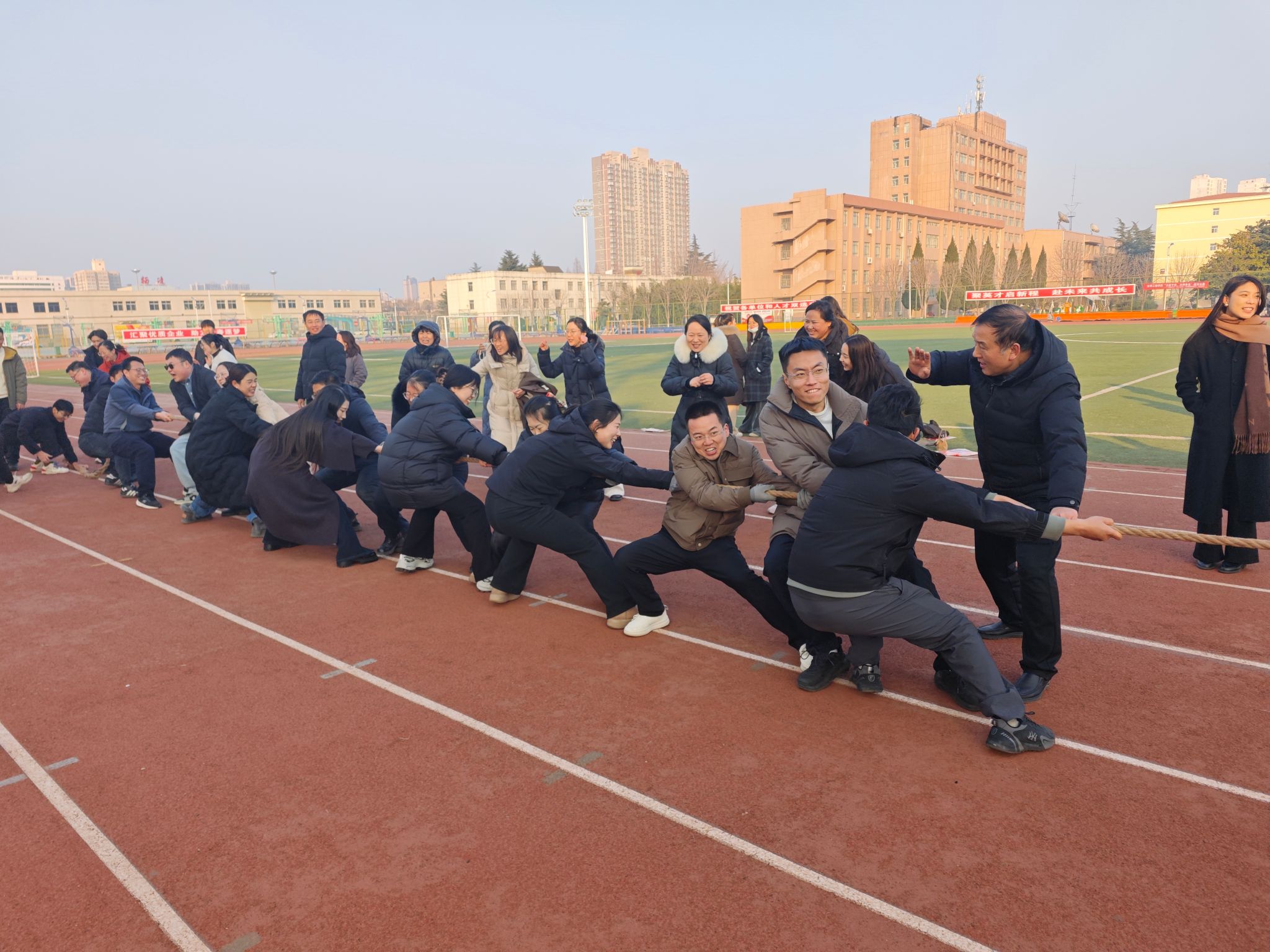 在充满欢声笑语的新春视频录制环节,大家手捧“福”字、笑容洋溢,分别表达了对学校发展和全体师生的美好祝愿。随后的体育趣味竞赛环节,“捕鱼达人”与拔河项目妙趣横生,各小组成员通力协作、默契配合、奋勇争先,生动展现了学工队伍团结拼搏、积极向上的精神风貌。