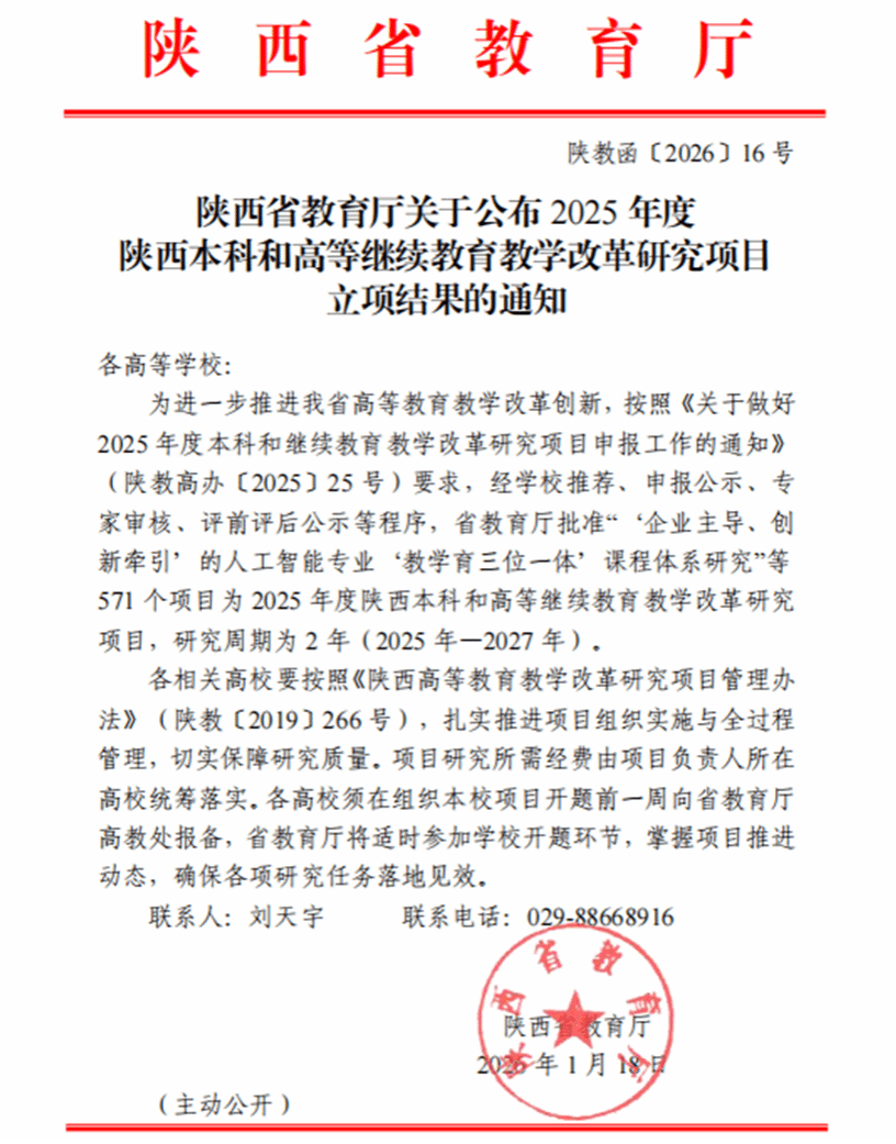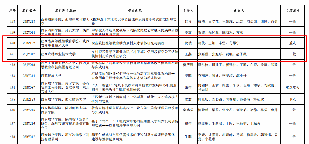 近日,省教育厅公布了2025年度陕西本科和高等继续教育教学改革研究项目立项结果,我校继续教育与培训学院黄璞团队申报的《职业院校继续教育助力乡村人才培养研究与实践》、生物工程学院王燕团队申报的《乡村振兴背景下职业农民(村干部)学历教育学分互认转换机制及培养路径研究》2个项目获批立项。