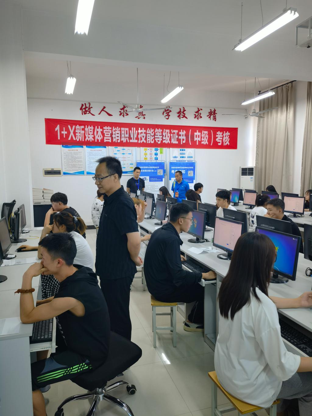 “1+X”新媒体营销职业技能等级(中级)考试严格按照教育部相关规定和考核相关标准有序进行,考前该院对29名报名学生进行了培训,经过多次考试和筛选,最后确认25名学生参加此次考试。本次技能理论考试、技能操作能力考试合并采用闭卷机考方式,考试时长共计120分钟。成绩达到60分及以上为合格,成绩合格者颁发相应级别的职业技能等级证书。