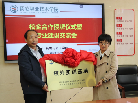 会上,佛山市互脉生物科技有限公司向药物与化工学院捐赠了一批价值154560元的教学实训设备。周博代表药物与化工学院向西北农林科技大学校医院、佛山市互脉生物科技有限公司授予校外实训基地牌子。