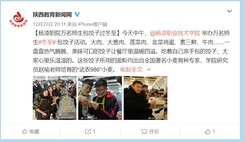 今天中午,@杨凌职业技术学院 举办万名师生#冬至# 包饺子活动。大肉、大葱肉、莲菜肉、韭菜鸡蛋、素三鲜、牛肉……一盘盘热气腾腾、美味可口的饺子让餐厅里温暖四溢。吃着自己亲手包的饺子,大家心里乐滋滋的。这些饺子所用的面粉均出自全国著名小麦育种专家、学院研究员赵瑜老师培育的“武农986”小麦。