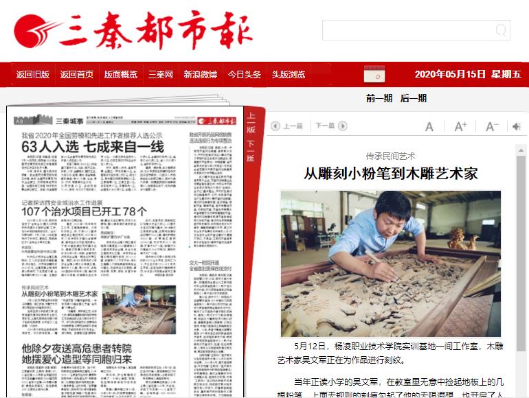 5月12日,杨凌职业技术学院实训基地一间工作室,木雕艺术家吴文军正在为作品进行刻纹。