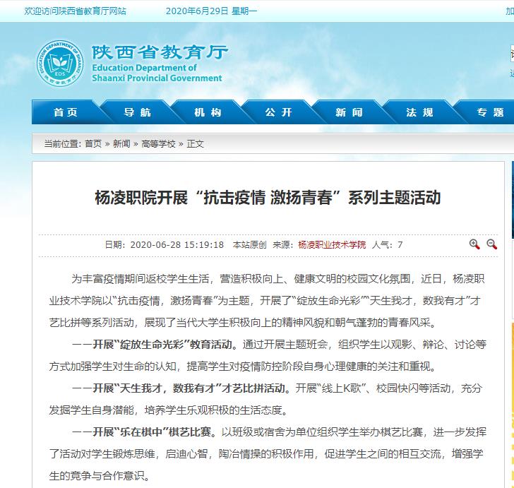 为丰富疫情期间返校学生生活,营造积极向上、健康文明的校园文化氛围,近日,杨凌职业技术学院以“抗击疫情,激扬青春”为主题,开展了“绽放生命光彩”“天生我才,数我有才”才艺比拼等系列活动,展现了当代大学生积极向上的精神风貌和朝气蓬勃的青春风采。