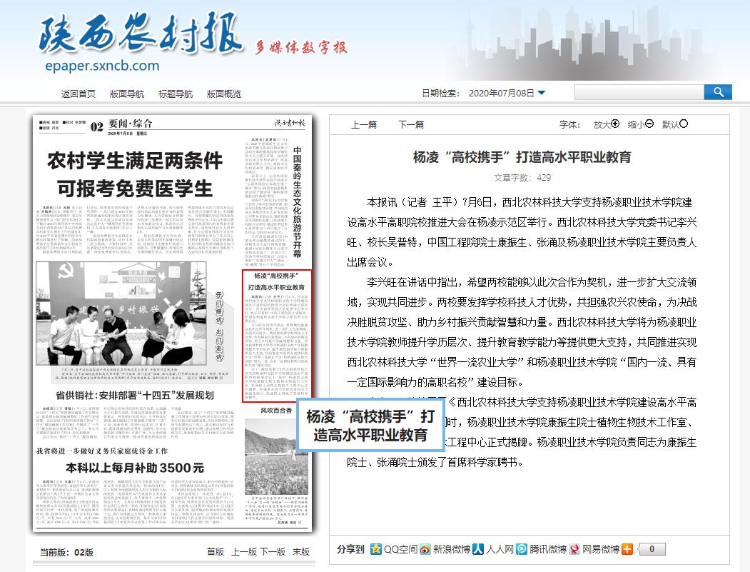 本报讯(记者 王平)7月6日,西北农林科技大学支持杨凌职业技术学院建设高水平高职院校推进大会在杨凌示范区举行。西北农林科技大学党委书记李兴旺、校长吴普特,中国工程院院士康振生、张涌及杨凌职业技术学院主要负责人出席会议。 李兴旺在讲话中指出,希望两校能够以此次合作为契机,进一步扩大交流领域,实现共同进步。两校要发挥学校科技人才优势,共担强农兴农使命,为决战决胜脱贫攻坚、助力乡村振兴贡献智慧和力量。西北农林科技大学将为杨凌职业技术学院教师提升学历层次、提升教育教学能力等提供更大支持,共同推进实现西北农林科技大学“世界一流农业大学”和杨凌职业技术学院“国内一流、具有一定国际影响力的高职名校”建设目标。 会上,两校签署了《西北农林科技大学支持杨凌职业技术学院建设高水平高职院校框架协议》。同时,杨凌职业技术学院康振生院士植物生物技术工作室、张涌院士动物生物技术工程中心正式揭牌。杨凌职业技术学院负责同志为康振生院士、张涌院士颁发了首席科学家聘书。