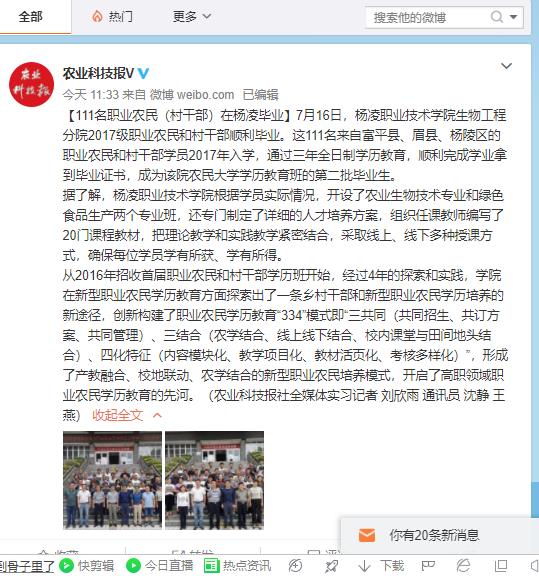 7月16日,杨凌职业技术学院生物工程分院2017级职业农民和村干部顺利毕业。这111名来自富平县、眉县、杨陵区的职业农民和村干部学员2017年入学,通过三年全日制学历教育,顺利完成学业拿到毕业证书,成为该院农民大学学历教育班的第二批毕业生。
