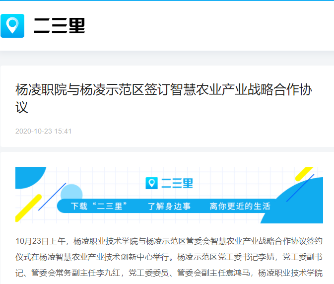 10月23日上午,杨凌职业技术学院与杨凌示范区管委会智慧农业产业战略合作协议签约仪式在杨凌智慧农业产业技术创新中心举行。杨凌示范区党工委书记李婧,党工委副书记、管委会常务副主任李九红,党工委委员、管委会副主任袁鸿马,杨凌职业技术学院党委书记陈宁,校长王周锁,副校长祝战斌等参加签约仪式。