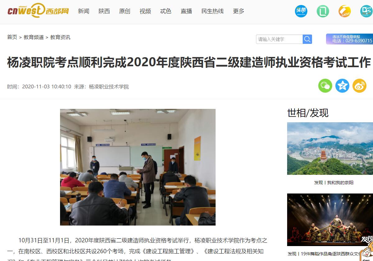 10月31日至11月1日,2020年度陕西省二级建造师执业资格考试举行,杨凌职业技术学院作为考点之一,在南校区、西校区和北校区共设260个考场,完成《建设工程施工管理》、《建设工程法规及相关知识》和《专业工程管理与实务》三个科目共计7800人次的考试任务。
