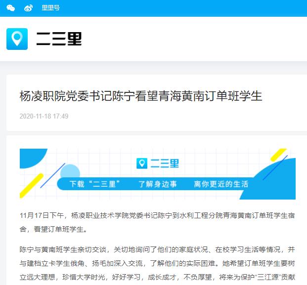 11月17日下午,杨凌职业技术学院党委书记陈宁到水利工程分院青海黄南订单班学生宿舍,看望订单班学生。