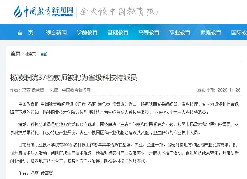 中国教育报-中国教育新闻网讯(记者 冯丽 通讯员 侯慧贤)近日,根据陕西省委组织部、省科技厅、省人力资源和社会保障厅下发的通知,杨凌职业技术学院37位教师被认定为省级自然人科技特派员,学校被认定为法人科技特派员。