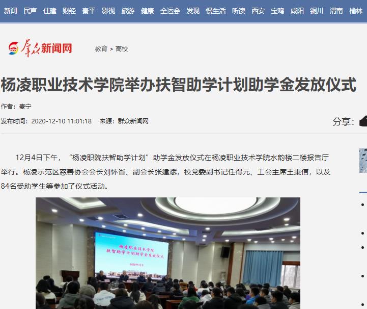此次扶智助学计划的助学金来源于杨凌职院师生的捐款、腾讯99公益网络配捐款及社会爱心人士的爱心基金。捐款活动由杨凌示范区慈善协会搭建平台,杨凌职院工会牵头实施,有近2000余名师生参与了活动,共收到善款84000元,受助学生84人。(通讯员 麦宁)