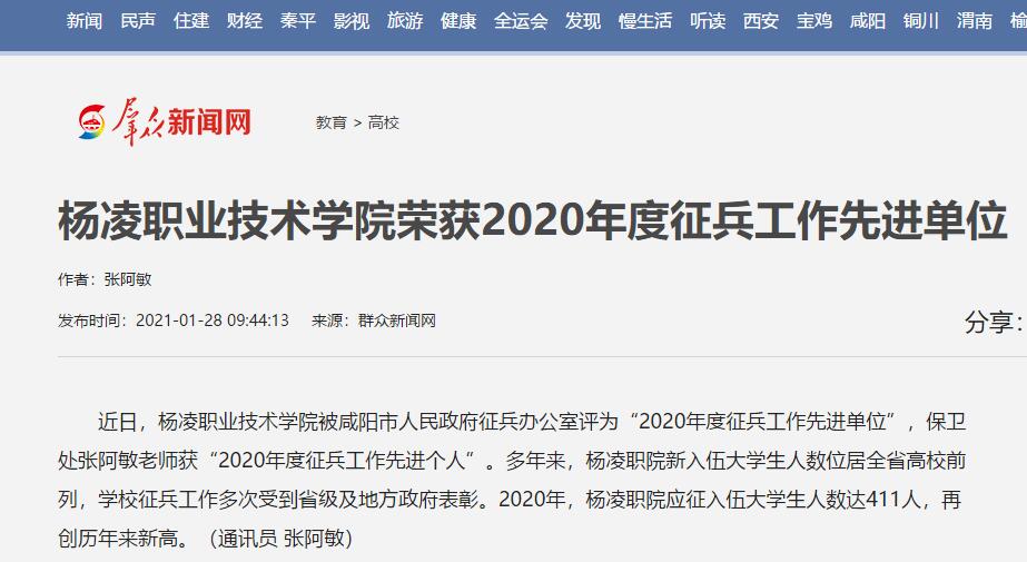 近日,杨凌职业技术学院被咸阳市人民政府征兵办公室评为“2020年度征兵工作先进单位”,保卫处张阿敏老师获“2020年度征兵工作先进个人”。多年来,杨凌职院新入伍大学生人数位居全省高校前列,学校征兵工作多次受到省级及地方政府表彰。2020年,杨凌职院应征入伍大学生人数达411人,再创历年来新高。(通讯员 张阿敏)