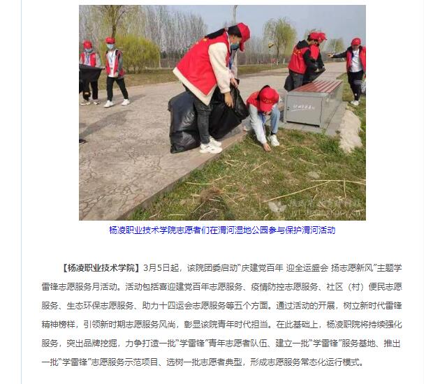 【杨凌职业技术学院】3月5日起,该院团委启动“庆建党百年 迎全运盛会 扬志愿新风”主题学雷锋志愿服务月活动。活动包括喜迎建党百年志愿服务、疫情防控志愿服务、社区(村)便民志愿服务、生态环保志愿服务、助力十四运会志愿服务等五个方面。通过活动的开展,树立新时代雷锋精神榜样,引领新时期志愿服务风尚,彰显该院青年时代担当。在此基础上,杨凌职院将持续强化服务,突出品牌挖掘,力争打造一批“学雷锋”青年志愿者队伍、建立一批“学雷锋”服务基地、推出一批“学雷锋”志愿服务示范项目、选树一批志愿者典型,形成志愿服务常态化运行模式。