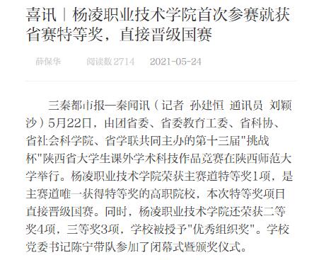 三秦都市报—秦闻讯(记者 孙建恒 通讯员 刘颖沙)5月22日,由团省委、省委教育工委、省科协、省社会科学院、省学联共同主办的第十三届"挑战杯"陕西省大学生课外学术科技作品竞赛在陕西师范大学举行。杨凌职业技术学院荣获主赛道特等奖1项,是主赛道唯一获得特等奖的高职院校,本次特等奖项目直接晋级国赛。同时,杨凌职业技术学院还荣获二等奖4项,三等奖3项,学校被授予"优秀组织奖"。学校党委书记陈宁带队参加了闭幕式暨颁奖仪式。