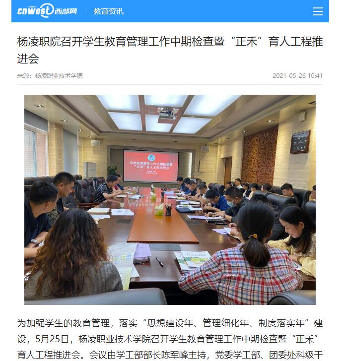 为加强学生的教育管理,落实“思想建设年、管理细化年、制度落实年”建设,5月25日,杨凌职业技术学院召开学生教育管理工作中期检查暨“正禾”育人工程推进会。会议由学工部部长陈军峰主持,党委学工部、团委处科级干部,各学院学工办主任、辅导员代表等40余人参加了会议。