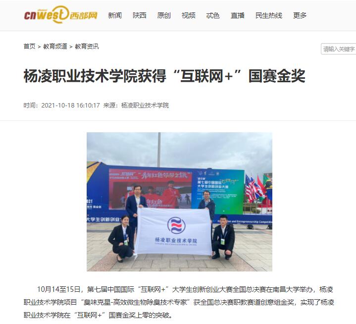 10月14至15日,第七届中国国际“互联网+”大学生创新创业大赛全国总决赛在南昌大学举办,杨凌职业技术学院项目“臭味克星-高效微生物除臭技术专家”获全国总决赛职教赛道创意组金奖,实现了杨凌职业技术学院在“互联网+”国赛金奖上零的突破。
