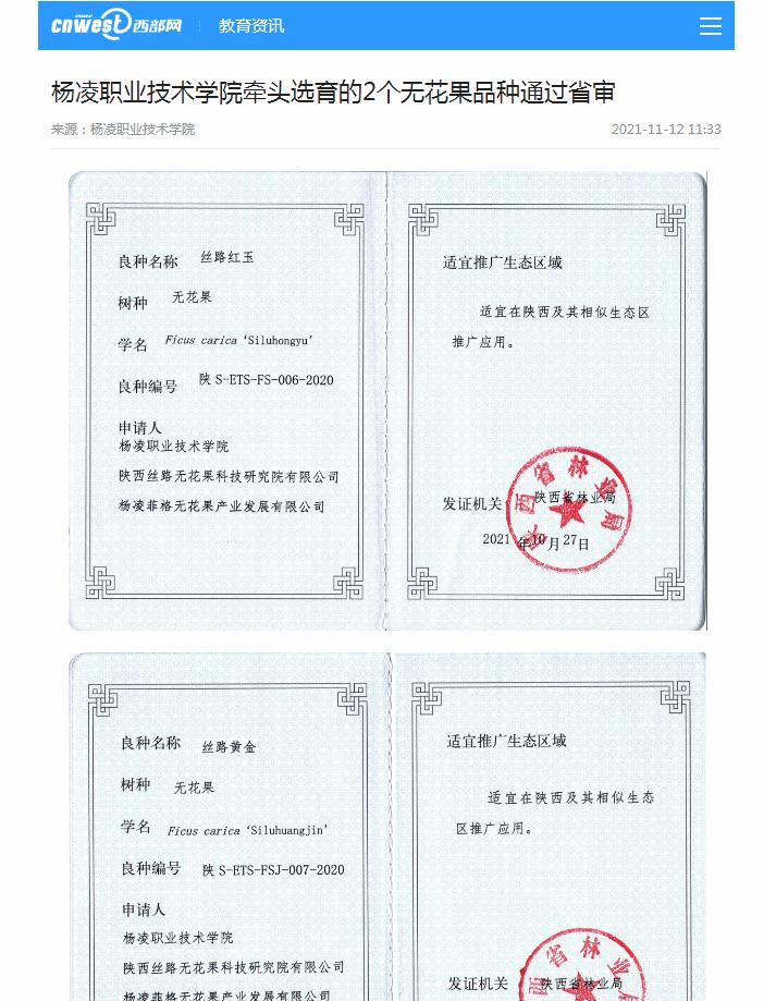 10月27日,陕西省林业局发布了2020年度陕西省林木良种名录,经陕西省林木和草品种审定委员会审定,全省共有33个品种为省级林木良种。由杨凌职业技术学院教授钱拴提团队选育的无花果新品种“丝路红玉”和“丝路黄金”通过省级林木良种审定,这是学校“双高”建设和提质培优行动计划的又一标志性成果。