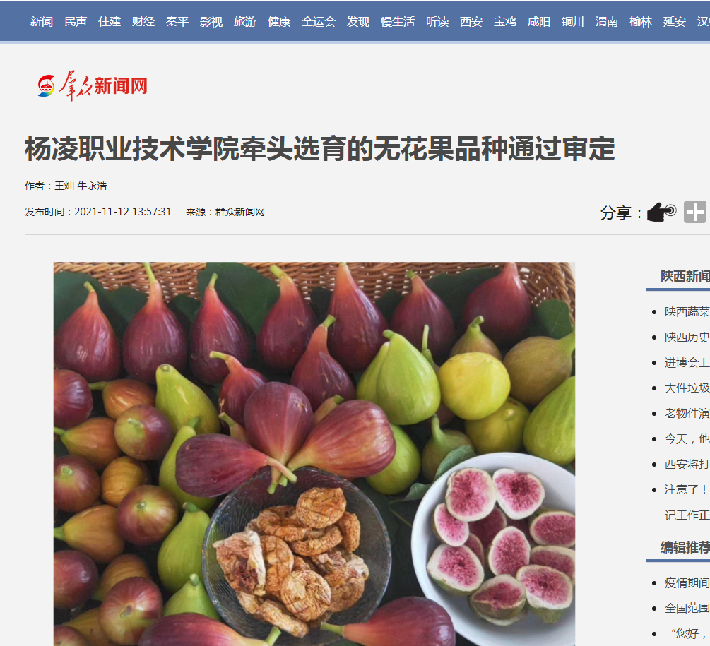 10月27日,陕西省林业局发布了2020年度陕西省林木良种名录,经陕西省林木和草品种审定委员会审定,全省共有33个品种为省级林木良种。由杨凌职业技术学院钱拴提教授团队选育的无花果新品种“丝路红玉”和“丝路黄金”通过省级林木良种审定,这是杨凌职业技术学院“双高”建设和提质培优行动计划的又一标志性成果。