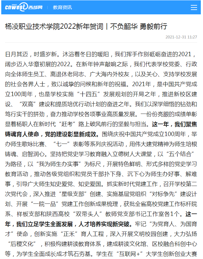 这一年,我们着眼中外合作办学,国际交流开创新局面。开展多层次、多元化的国际交流活动,在几内亚、乌兹别克斯坦分别成立几内亚水利工程学院、杨凌职业技术学院古利斯坦国立大学现代农业学院,启动实施“中国—以色列现代节水工程课程合作项目”,积极参与上合农业基地中乌现代农业科技示范园建设,并在乌兹别克斯坦成立现代农业技术创新示范基地,学校国际化办学水平显著提升。多难兴邦聚众力,同舟共济勇担当。近期,我省全力以赴做好新冠肺炎疫情防控工作,希望广大师生继续弘扬伟大抗疫精神,严格遵守疫情防控各项规定,切实做好个人防护,以坚定的信心与必胜的决心等待云开雾散、静候繁华盛景,以奋斗者的姿态向2022年全力进发,不断开创新时代学校事业发展的新局面。最后,衷心祝愿全体师生员工、离退休老同志、广大海内外校友以梦为马,不负韶华!岁岁常欢愉,万事皆胜意!祝愿我们杨凌职业技术学院基业常青、欣欣向荣!