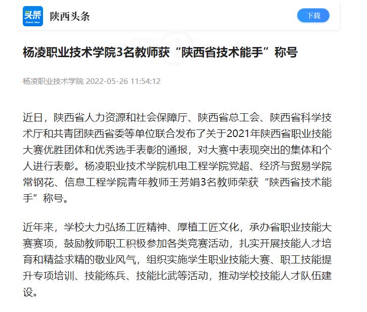 近日,陕西省人力资源和社会保障厅、陕西省总工会、陕西省科学技术厅和共青团陕西省委等单位联合发布了关于2021年陕西省职业技能大赛优胜团体和优秀选手表彰的通报,对大赛中表现突出的集体和个人进行表彰。杨凌职业技术学院机电工程学院党超、经济与贸易学院常钢花、信息工程学院青年教师王芳娟3名教师荣获“陕西省技术能手”称号。