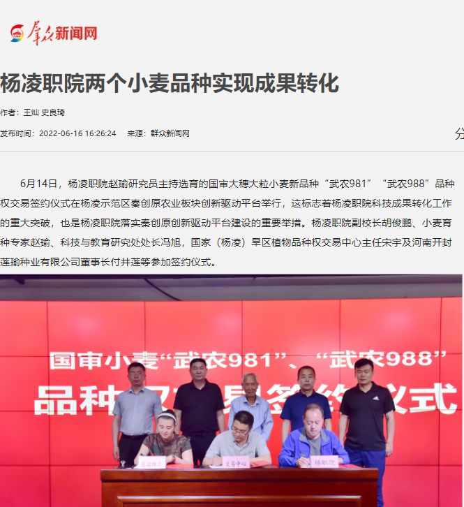 6月14日,杨凌职院赵瑜研究员主持选育的国审大穗大粒小麦新品种“武农981”“武农988”品种权交易签约仪式在杨凌示范区秦创原农业板块创新驱动平台举行,这标志着杨凌职院科技成果转化工作的重大突破,也是杨凌职院落实秦创原创新驱动平台建设的重要举措。杨凌职院副校长胡俊鹏、小麦育种专家赵瑜、科技与教育研究处处长冯旭,国家(杨凌)旱区植物品种权交易中心主任宋宇及河南开封莲瑜种业有限公司董事长付井莲等参加签约仪式。