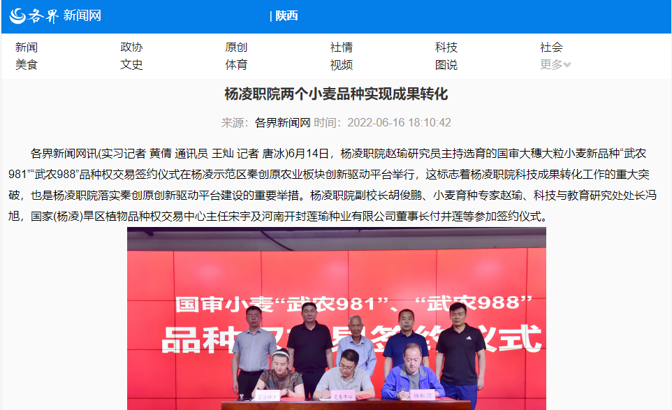 【各界新闻网】杨凌职院两个小麦品种实现成果转化