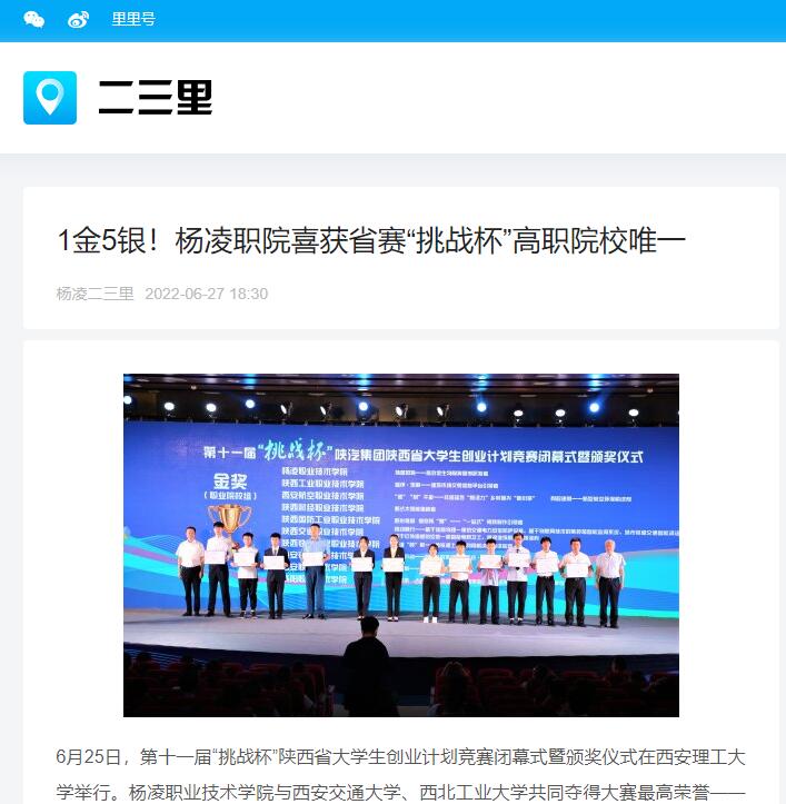 6月25日,第十一届“挑战杯”陕西省大学生创业计划竞赛闭幕式暨颁奖仪式在西安理工大学举行。杨凌职业技术学院与西安交通大学、西北工业大学共同夺得大赛最高荣誉——“挑战杯”,是唯一获此殊荣的高职院校,学校参赛项目荣获金奖1项,银奖5项。