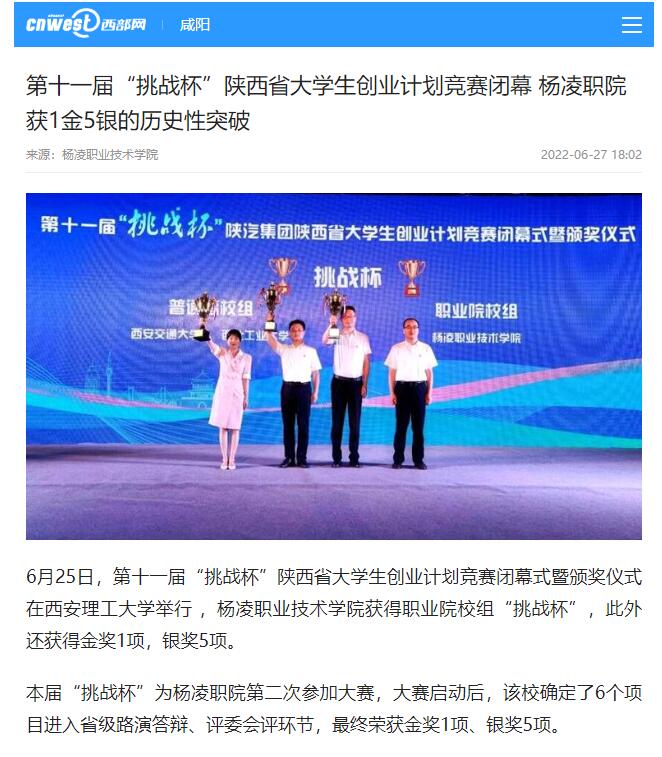 6月25日,第十一届“挑战杯”陕西省大学生创业计划竞赛闭幕式暨颁奖仪式在西安理工大学举行 ,杨凌职业技术学院获得职业院校组“挑战杯”,此外还获得金奖1项,银奖5项。