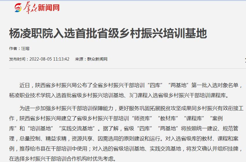近日,陕西省乡村振兴局公布了全省乡村振兴干部培训“四库”“两基地”第一批入选对象名单,杨凌职业技术学院入选首批省级乡村振兴培训基地、3门课程入选省级乡村振兴干部培训课程库。