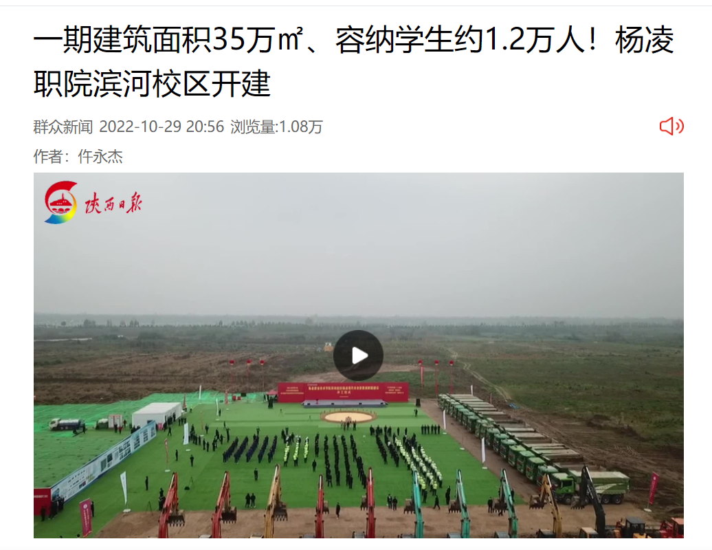 10月29日,杨凌职业技术学院滨河校区建设开工仪式在杨凌示范区举行。滨河校区位于杨凌示范区滨河路以南、河堤路以北,总建筑面积55万平方米,为2022年省级重点项目。其中,一期总建筑面积35万平方米,总投资25.5亿元,可容纳学生约1.2万人,主要建设图文信息办公综合中心、理实一体楼、现代农业产教融合实训中心、学生文体中心等。