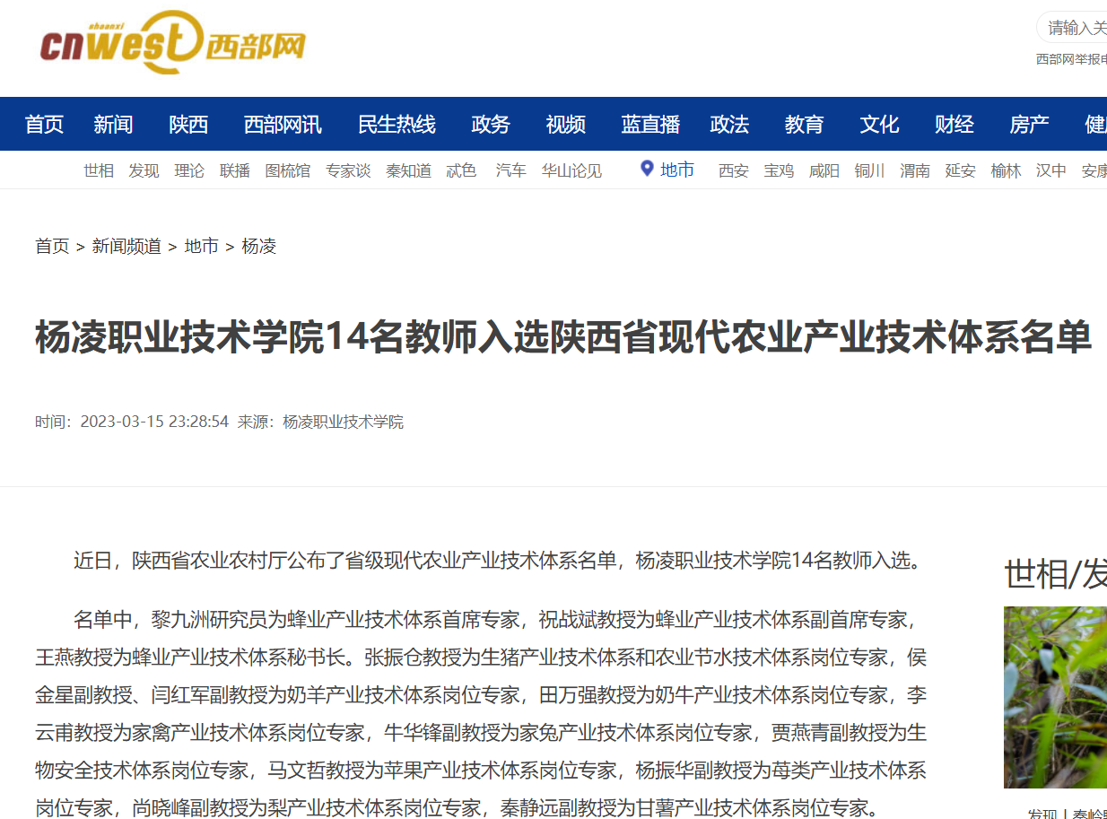 【西部网】杨凌职院14名教师入选陕西省现代农业产业技术体系名单