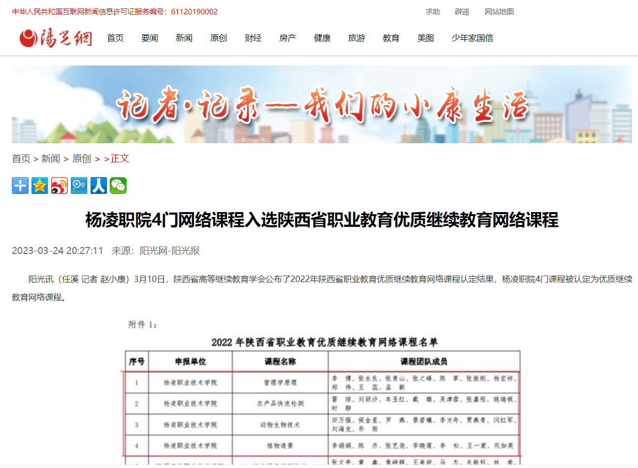 阳光讯(任溪 记者 赵小康)3月10日,陕西省高等继续教育学会公布了2022年陕西省职业教育优质继续教育网络课程认定结果,杨凌职院4门课程被认定为优质继续教育网络课程。