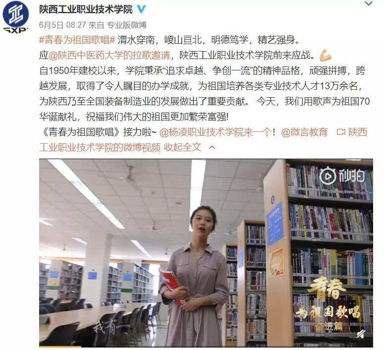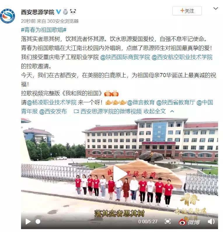今天,我们在渭水之畔、农科新城,接到陕西工业职业技术学院和西安思源学院的拉歌邀请,用歌声为祖国70华诞献礼。