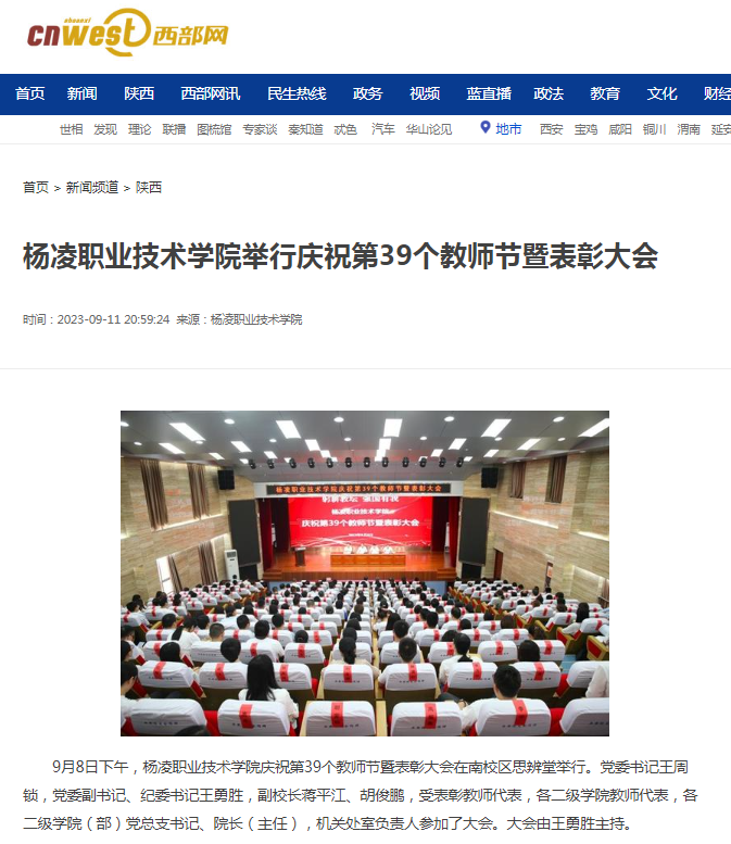 9月8日下午,杨凌职业技术学院庆祝第39个教师节暨表彰大会在南校区思辨堂举行。党委书记王周锁,党委副书记、纪委书记王勇胜,副校长蒋平江、胡俊鹏,受表彰教师代表,各二级学院教师代表,各二级学院(部)党总支书记、院长(主任),机关处室负责人参加了大会。大会由王勇胜主持。